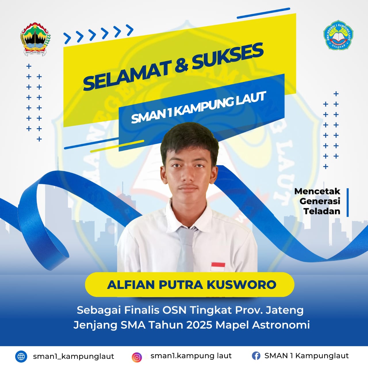 Salah satu siswa terbaik SMAN 1 Kampung Laut, Alfian Putra Kusworo, berhasil meraih prestasi gemilang sebagai finalis Olimpiade Sains Nasional (OSN) Tingkat Provinsi Jawa Tengah Tahun 2025 pada bidang Astronomi. Prestasi ini merupakan hasil kerja keras dan dedikasi Alfian dalam mempersiapkan diri melalui berbagai tahapan seleksi.