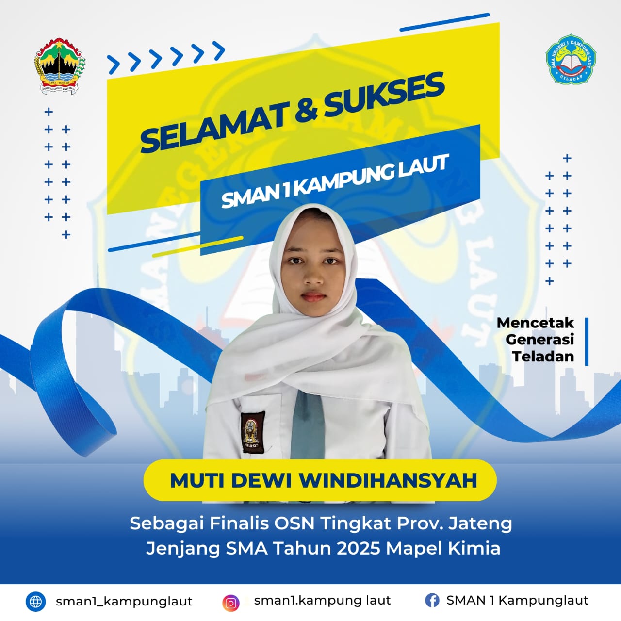Prestasi membanggakan kembali diraih oleh SMAN 1 Kampung Laut. Kali ini, Muti Dewi Windihansyah berhasil terpilih sebagai finalis Olimpiade Sains Nasional (OSN) Tingkat Provinsi Jawa Tengah Tahun 2025 pada mata pelajaran Kimia. Pencapaian ini menunjukkan kualitas dan potensi besar yang dimiliki oleh para siswa di sekolah tersebut.